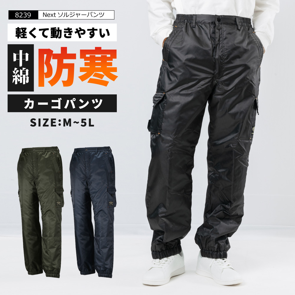 防寒性と機動性を両立!中綿入りで暖かく、大容量ポケット付きのミリタリー調パンツ。着脱簡単、裾調節機能で幅広い体型に対応。